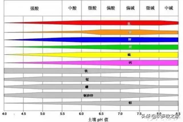 彩色及灰色横条越宽表示该养分的吸收效率越高,越细表示吸收效率越低,数字表示土壤酸碱度(pH值)。